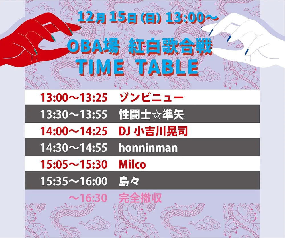 OBA場 紅白歌合戦 公演日 2024.12.15 [Sun] 会場 新宿 ROCK CAFE LOFT 〒160-0021 東京都新宿区歌舞伎町1丁目28−5 【 GoogleMap 】 Act Milco DJ小吉川晃司 ゾンビニュー 島々 性闘士☆準矢 honninman Open/Start 13:00/13:00
